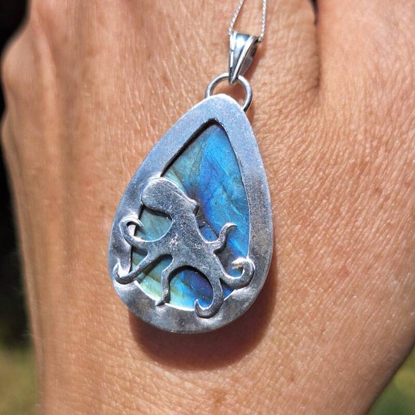 Derrière cette sublime labradorite, une petite pieuvre vous accompagnera.