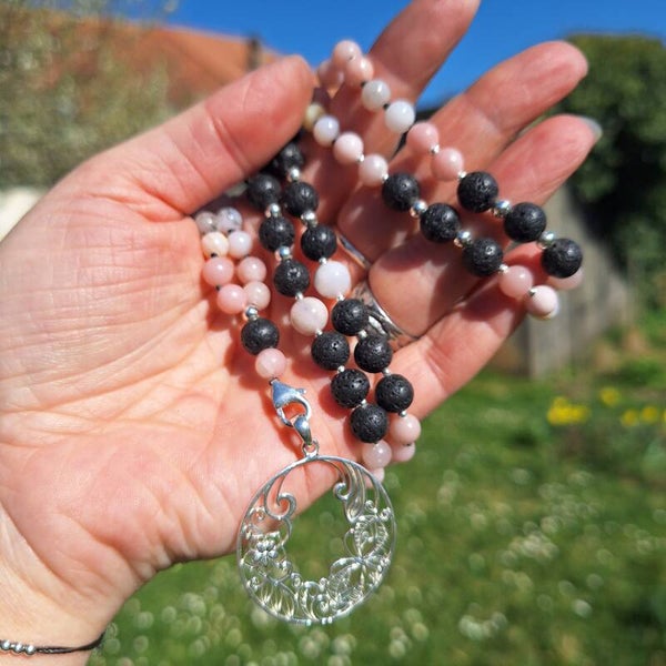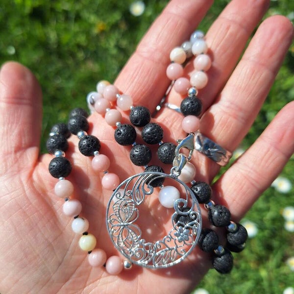 Ce sautoir entièrement noué main est composé de perles en calcite rose et de lave, agrémenté de perles et pièces en argent 925.