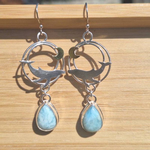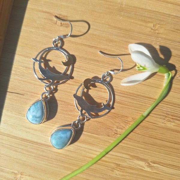 Ces merveilleuses boucles d'oreilles ont été composées autour de deux gouttes en larimar.