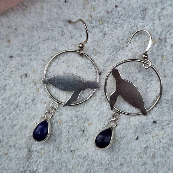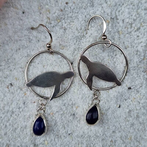 Boucles d'oreilles entièrement réalisées main dans notre atelier avec des tortues marines et deux petites gouttes en lapis lazuli.