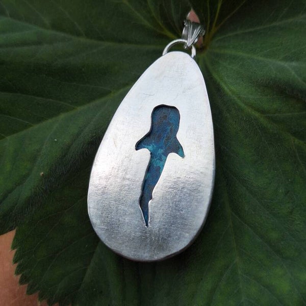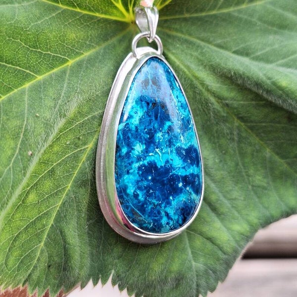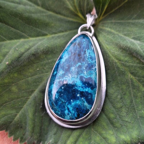 Pendentif en azurite shattukite avec inclusions de chrysocolle.