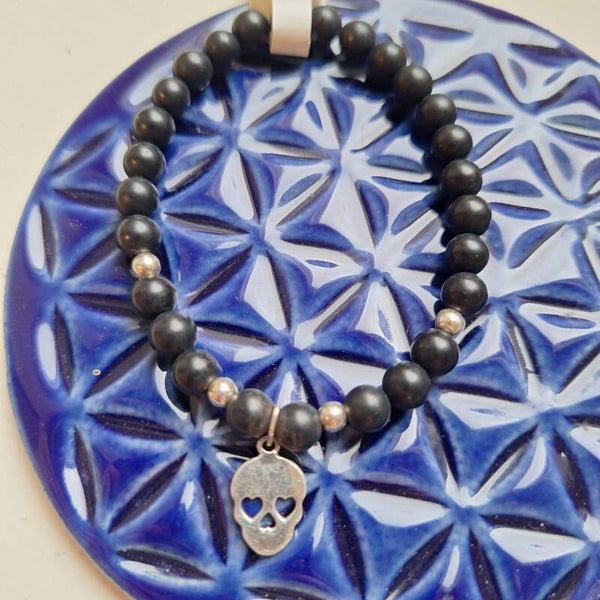 Bracelet élastique composé de perles en onyx mat 6mm, avec perles et pendentif en argent 925.