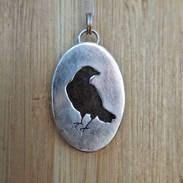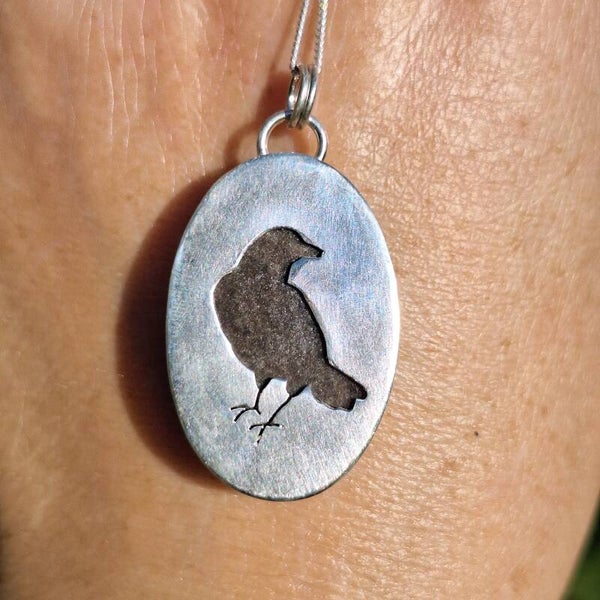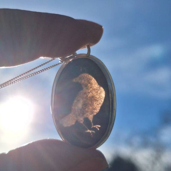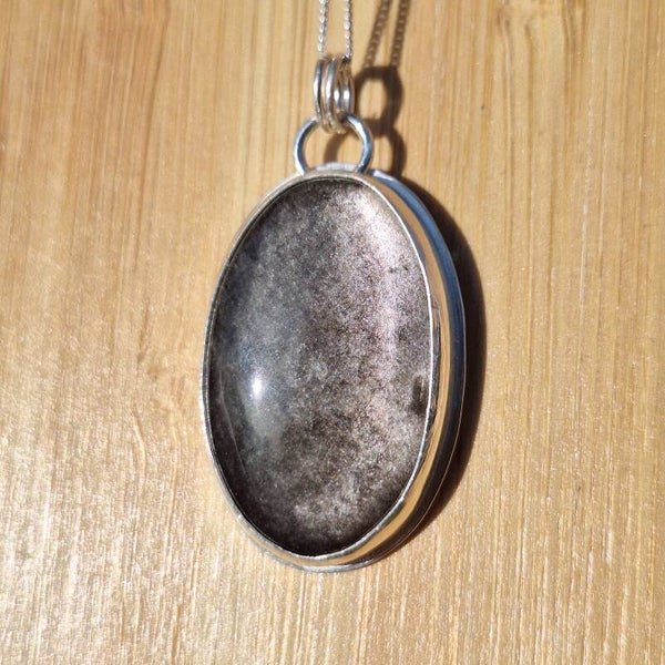 Ce joli pendentif est orné d'une magnifique obsidienne argentée. A l'arrière, un corbeau vous accompagnera.