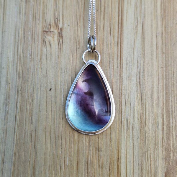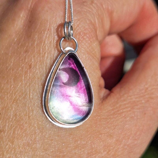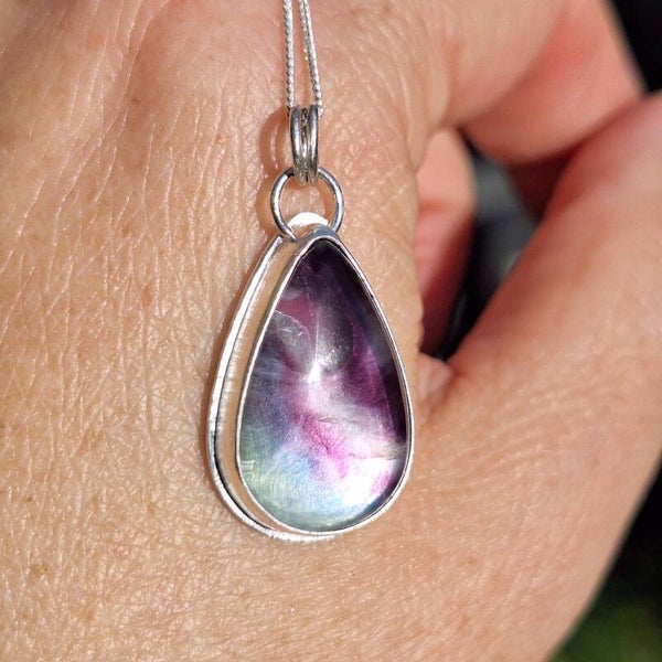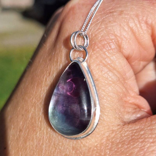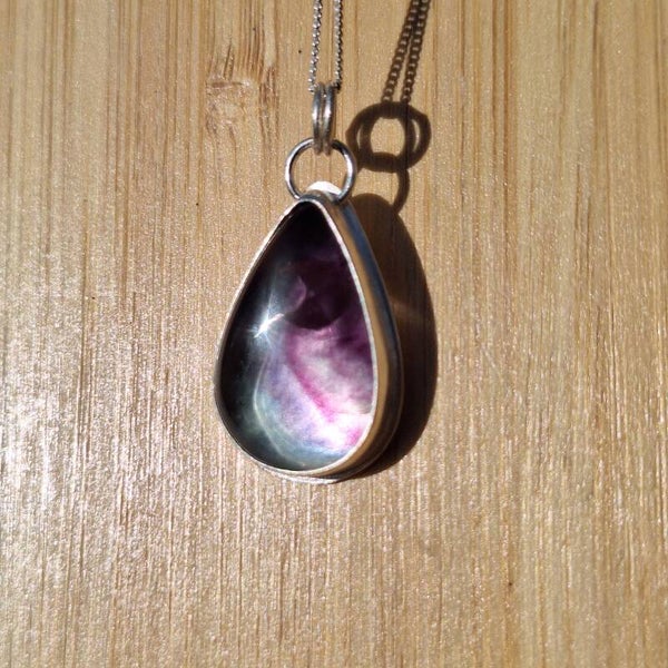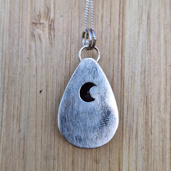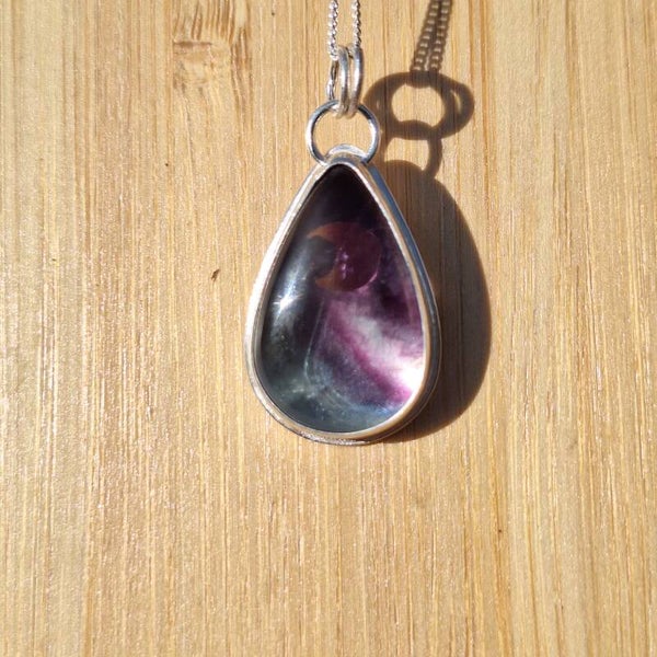 Ce joli pendentif est orné d'une éclatante fluorite. A l'arrière, une petite lune se voit en transparence.
