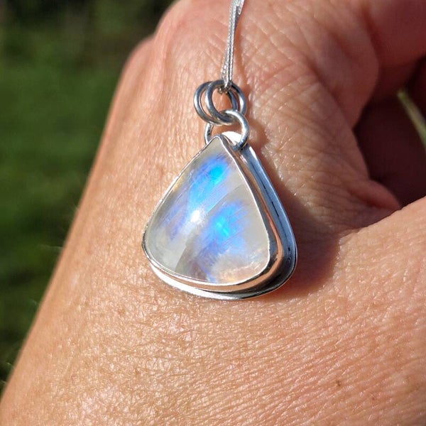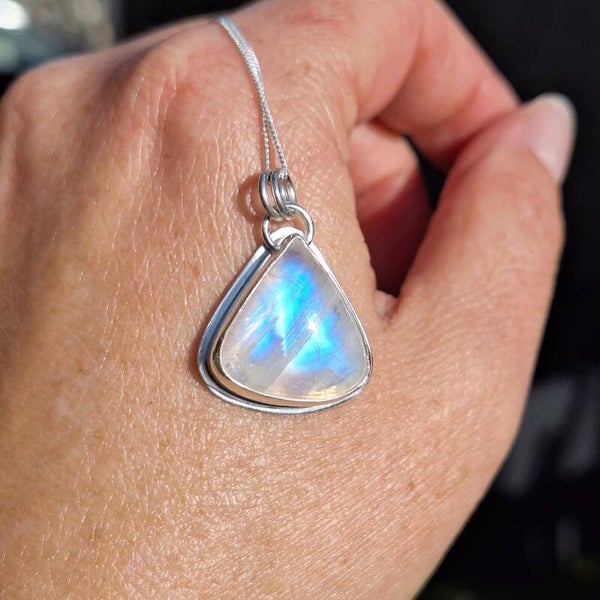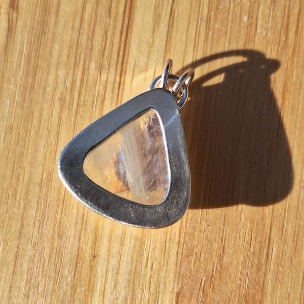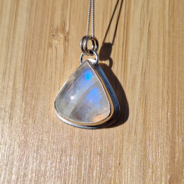 Ce joli pendentif est orné d'une éblouissante pierre de lune arc-en-ciel (péritérite). A l'arrière, un simple ajourage permet le contact avec la peau.