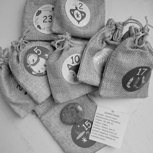 24 pierres sélectionnées spécialement pour le calendrier. 24 cartes explicatives. 24 sachets numérotés. CHF 125.- (Valeur à la pièce des minéraux - plus de CHF 175.-)