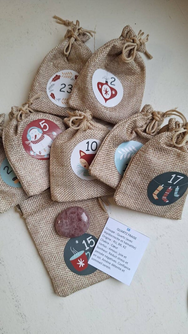 18 pierres sélectionné spécialement pour le calendrier. 7 bijoux faits spécialement pour l'occasion. 24 cartes explicatives. 24 sachets numérotés.