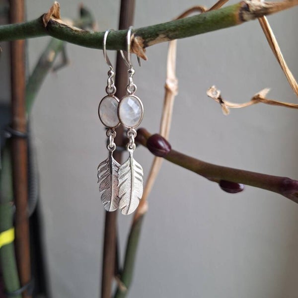 Boucles d'oreilles en argent 925 avec plumes et péristérite (pierre de lune arc-en-ciel)