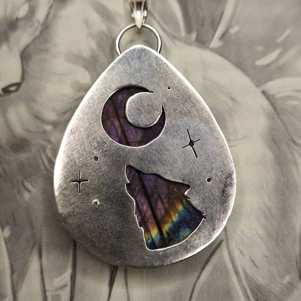 Grand pendentif réalisé avec une sublime labradorite multicolore. A l'arrière, un loup hurlant à la nuit étoilée vous accompagnera.
