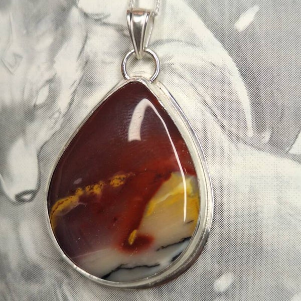 Cette merveilleuse mookaït (jaspe australien) a été montée en bijou dans notre atelier.