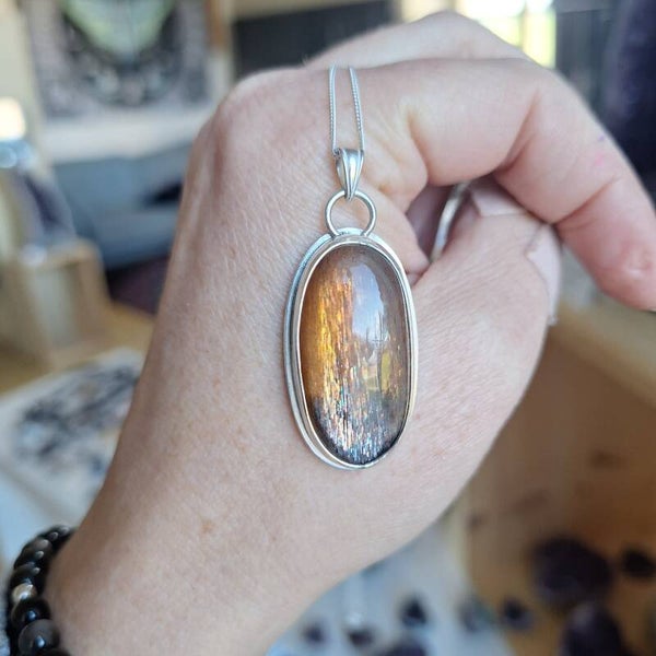 Pendentif en pierre de soleil bicolore, fait main avrc découpe soleil à l'arrière.