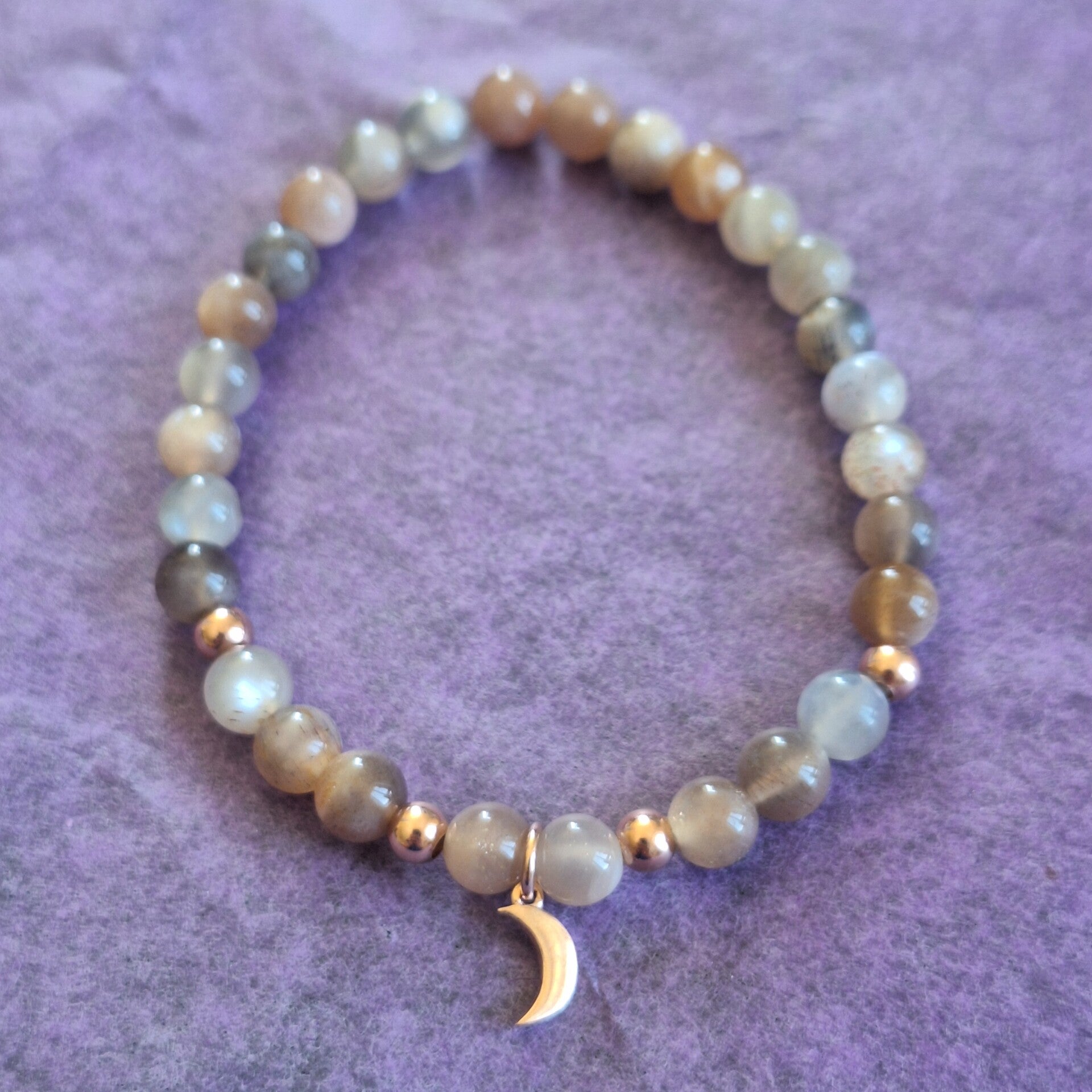 Bracelet en perles de pierre de lune 6mm, avec perles et pendentif en argent 925 plaqué doré rose.